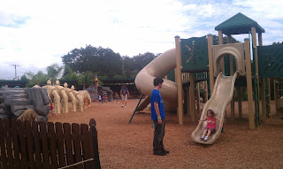 We began our journey walking out into a large open area with giant dinos and beautiful landscaping. To my little one’s delight, we came upon a Preschool/Toddler playland area almost immediately – full of brightly colored dinosaur-themed slides and ride on equipment. They even had toddler safe swings for my 18 month old to enjoy, although my five year old wanted to swing on them too. Lol.
