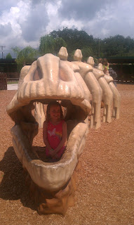 Here you can see a larger playground with dinosaur themed climbing equipment designed for older children in the elementary age group.